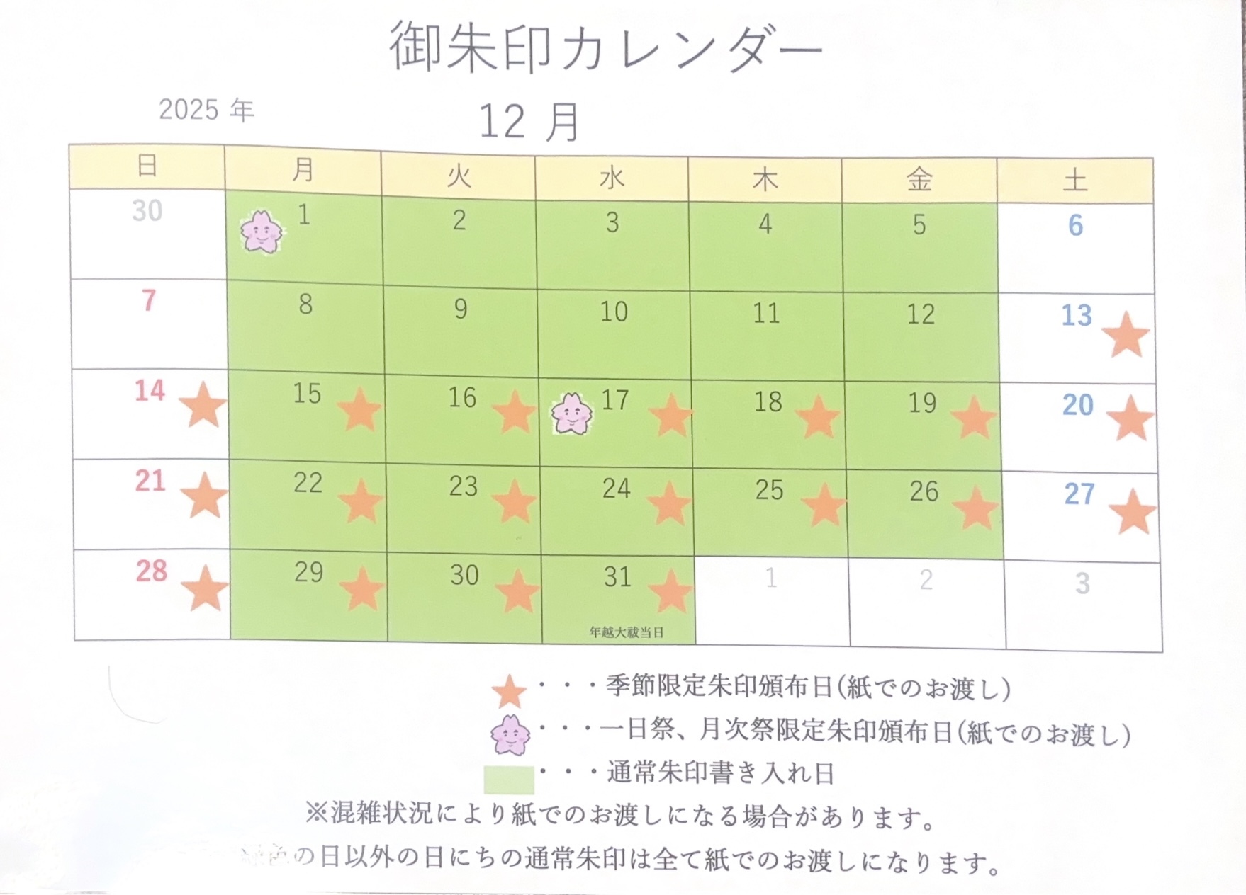 2026年 1月御朱印カレンダー 2026年 1月の御朱印カレンダーになります 1月は毎年神社が大変込み合いますため、通常御朱印の書き入れは1月1日~4日までとさせていただきます。 それ以降の1月中は全て紙でお渡しになりますので、何卒ご了承願います。 なお、限定御朱印は全て紙でのお渡し。干支の限定御朱印はなくなり次第終了の為、終了日は確定しておりません。 ご参拝の際ご確認ください