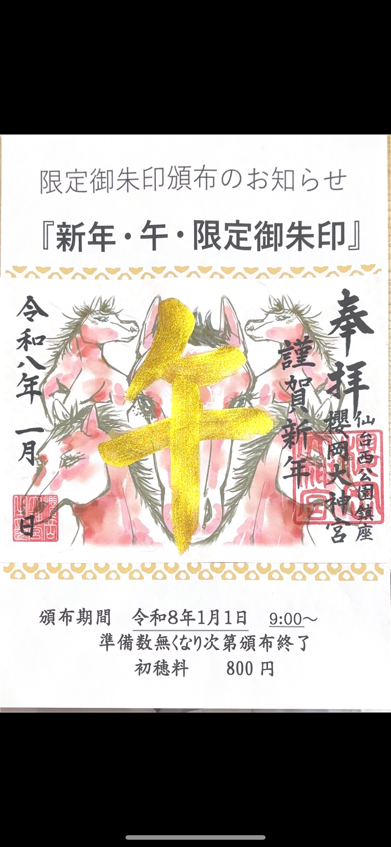 1月限定朱印頒布のお知らせ 1月限定朱印「干支・午年」頒布のお知らせ 頒布期間 2026年 1月1日 朝9時~ 初穂料 800円 紙でのお渡し。なくなり次第終了となります 年明けからの頒布で、1月1日の深夜(年越しを迎えた直後)には頒布いたしません。朝9時~の頒布となりますのでご注意ください ご参拝をお待ちしております