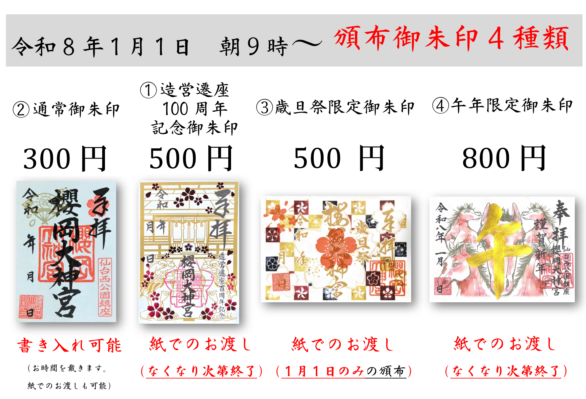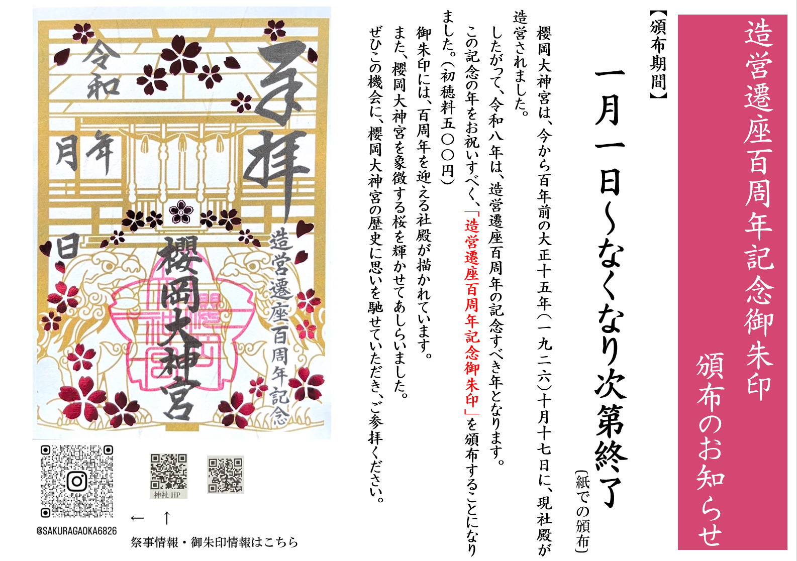 造営遷座100周年記念御朱印頒布のお知らせ 【西公園開園150周年記念御朱印】頒布のお知らせ 頒布期間:2026年 1月1日 朝9時~なくなり次第終了 初穂料:500円 100執念を迎える櫻岡大神宮の社殿と桜をあしらった記念御朱印です。どうぞ神社と社殿の歴史に思いを馳せつつご参拝ください。